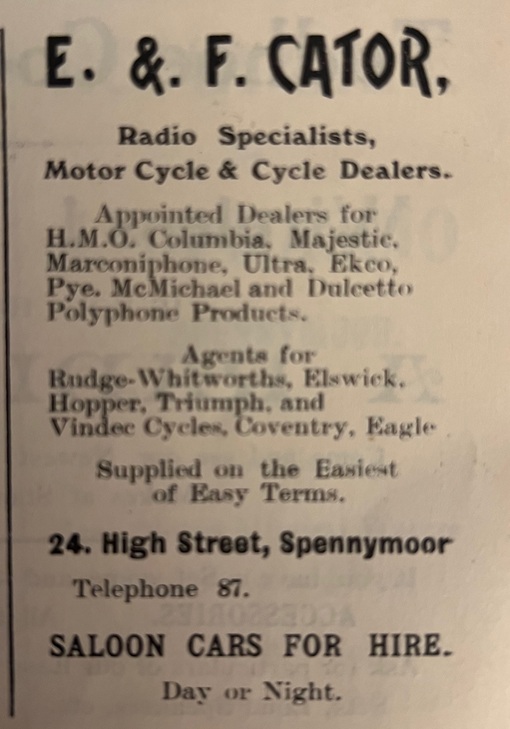 In 1921, aged 16, Ernest is a tea deliverer for Northern Tea Company, Spennymoor. He is living with his parents at 94 Upper Church Street, Spennymoor. He married Leslie Copeland in 1929. In 1939 Ernest is a cycle and radio dealer and a taxi proprietor living at 67 Clyde Terrace, Spennymoor with his wife and children, Leslie, Ernest G and Yvonne.